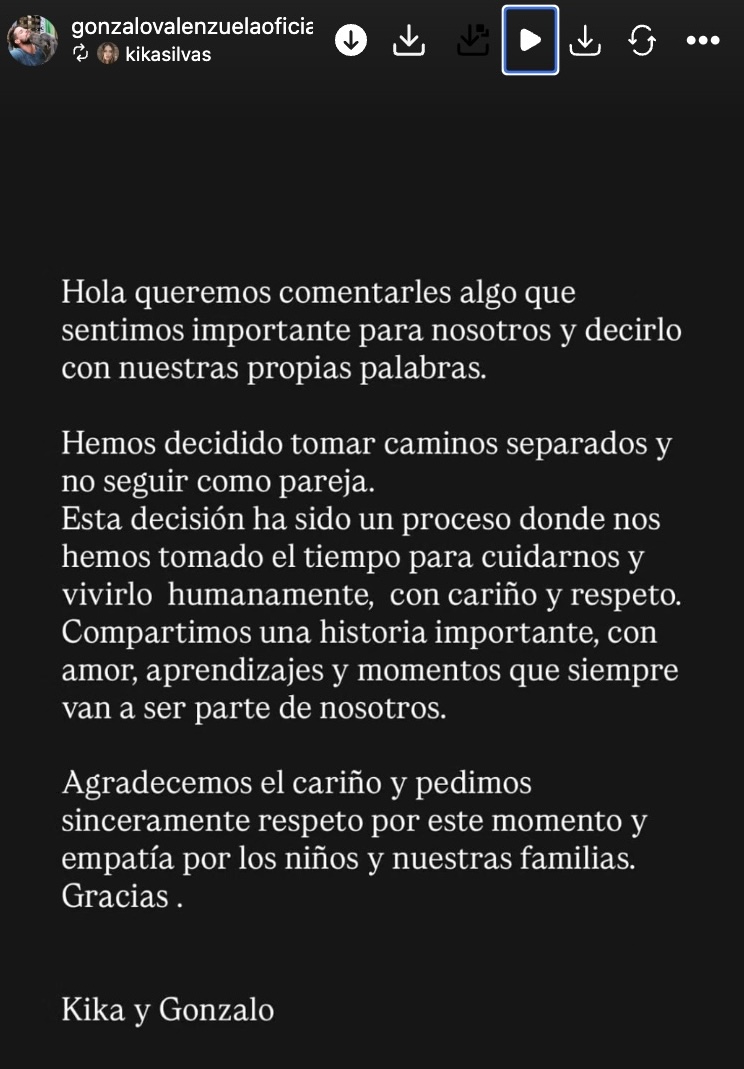 Ya habían rumores, Cecilia Gutiérrez también lo había adelantado y este martes la pareja lo confirmó. Gonzalo Valenzuela y Kika Silva están separados desde algunas semanas.