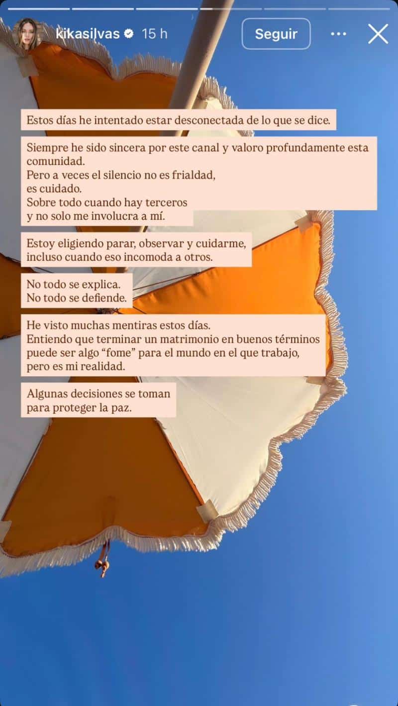 Kika Silva publicó un mensaje en el que explicó que ha preferido el silencio ante las versiones que circulan sobre su separación. Asegurando que esto no se trata de frialdad, sino más bien de cuidarse a sí misma e involucrados.