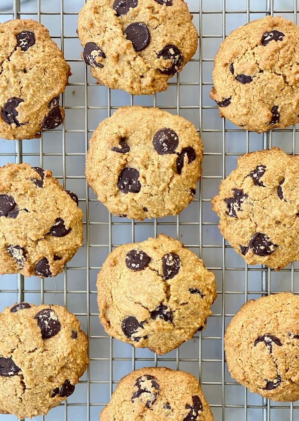 2.-Procesa los garbanzos cocidos con la mantequilla de maní, el syrup, la vainilla, la harina de avena, el bicarbonato y la sal hasta obtener una masa suave. La consistencia puede variar según la textura de la mantequilla de maní que uses. Deja entibiar la mezcla antes de agregar los chips de chocolate.